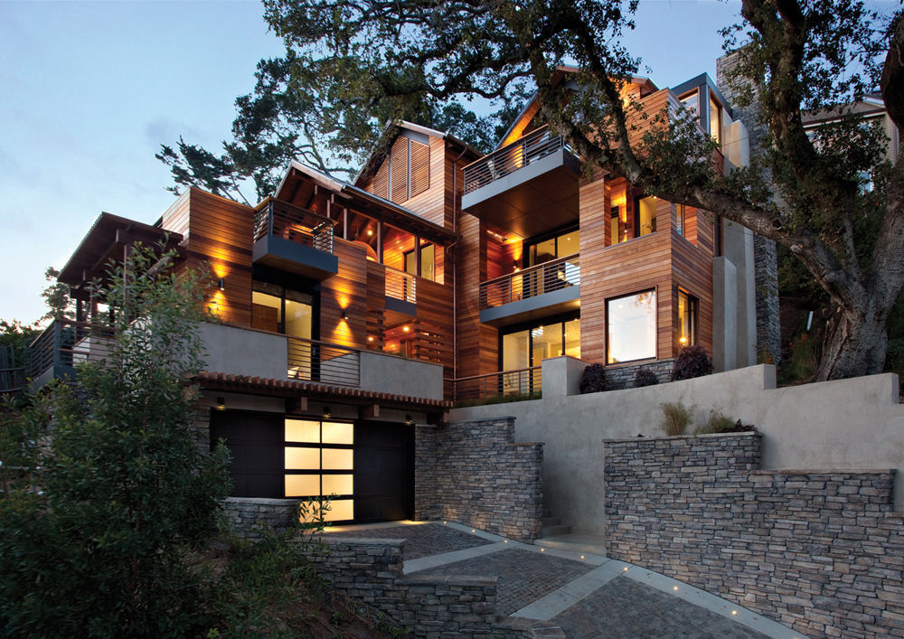 Tucked into a steep, hillside site just across from the Golden Gate Bridge in San Francisco, this custom home is the first LEED Platinum home in Marin County, and the second LEED Platinum home in Northern California. The goals for the design of this home were at once far-reaching and very close to home. The product of a dynamic collaboration between client / architect, interior designer, builder and a host of project partners who came together to create a project that would push the boundaries of sustainable design for custom homes, this new home was also designed by the architect for his own family.The design challenges, and ensuing opportunities, began with the site selection. Steep, narrow and filled with valuable existing oak trees, the lot seemed nearly unbuildable. However, architects are well known for being drawn to deeply challenging sites - particularly those within easy walking distance of one of the most desirable downtowns in the Bay Area. The resulting design was in every way a direct response to the site, trees and stunning views of downtown San Francisco. The architecture is a careful balance between modern sensibilities and the rustic, natural surroundings - a sustainable modern cabin. Set deep into the hillside, nearly 20% of the home's total square footage sits below grade. The hillside provides the lower floors with natural insulation, solar power supplies electricity and hot water, and radiant floor heating and an innovative air re-circulation system condition the interior. Local availability, recycled content, energy conservation and sustainable production drove the selection of every system, material, appliance and design detail.A central circulation core connects four levels of living spaces, each of which embraces the outdoors through expansive windows and decks. Every window opens to a view of the trees. Glass walls in the master suite retract and disappear to virtually eliminate the boundary between indoors and out. Covered outdoor spaces - an open-air entry and yoga deck protected by cedar rain screen, an indoor-outdoor family room directly off the kitchen - make the small conditioned footprint of this house live as if it were much larger. On the interior, rustic meets modern once again. Steel cross beams left to weather in the rain, ceilings of reclaimed fir from a deconstructed seed plant, and interior stairwell lined with discarded scaffolding beams (rendered unusable by new OSHA standards) promote the cabin vernacular. Open spaces, industrial materials, sleek wood finishes and high-efficiency automated systems keep the design from being referential. In the living area, paired joists allow a ridge beam to span 36 ft, negating the need for columns in this expansive space.The verticality of the architecture is carefully balanced by a multitude of horizontal elements. Horizontal cedar siding and rain screens, steel railings and detailing on the garage door ground the architecture on the exterior. Horizontal boards in the stairwell, and on all of the cabinetry, balance the soaring interior spaces. The elegant simplicity of the massing gives a modern edge to the traditional cabin vernacular, while the palette of Western Red Cedar, steel, stone, integrally-coloured eco-plaster and three shades of grey walks a similar line between industrial and natural. This highly sustainable design solution offers an architectural vocabulary that is a deeply authentic response to both its site and its multiple audiences - the family, the city, and the surrounding hills.Source